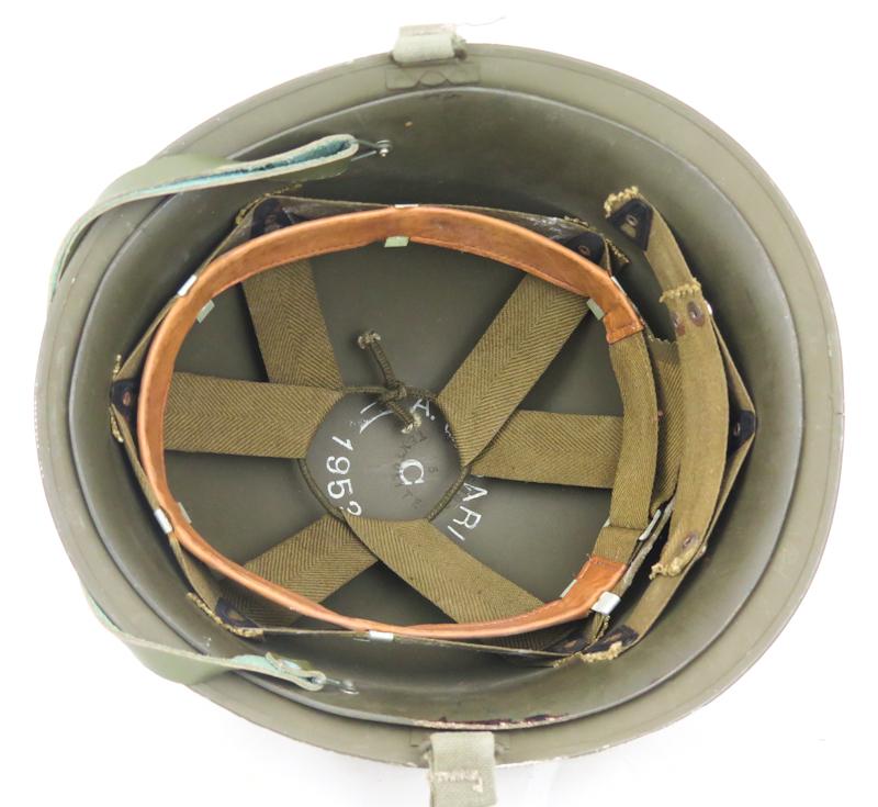 FIN Kylmän sodan Ranskan armeijan M51 OTAN teräskypärä. Ranskalainen kopio US M1 kypärästä. Oliivin vihreä kupu ja sisäkypärä. Kupu päivätty 1952 ja sisäkypärä 1953. Vihreät leukahihnat. Hyvä kuntoinen kypärä.