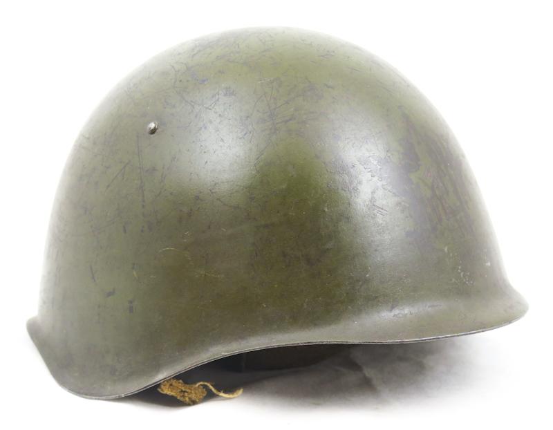 FIN 2MS aikainen Neuvostoliittolainen Ssh-39 Teräskypärä. Vihreä maalipinta. Etuosasta punatähti raaputettu pois, tähden hahmo nähtävillä ja hyvin vähän punaista maalia tähdestä jäljellä. Kulunut päällysosa, jossa pieni lommo luodista. Sisusta harvinainen vaalea nahka versio. Sisustan panta katkennut takaosastaan ja kiinnikkeestään. Muste leima hyvin luettavissa, teksti "POCT 2, 1939". Lyöntileima näkyvillä, " 2 1976". Ruskea kangas leukahihna, niitit hieman ruostuneet. Suhteellisen harvinainen kypärä, alkuperäisessä kunnossa. Punatähti raaputettu pois, viittaa Suomen armeijan käyttöön. Hieno, aito Puna-armeijan kypärä!