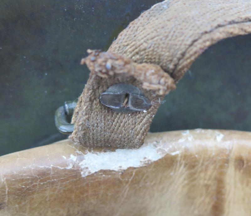 ENG WW2 Soviet steelhelmet SSh-39. Green original paint. Red star from front of helmet scratched away, outline of star visible and some remains of original red paint. Very small dent at side of helmet from a bullet. Liner rare white leather version, the liner band has gut broken and back band also. Black ink marking readable "POCT 2, 1939", marking on shell "2 1976"at back of helmet. Khaki strap, metal parts rusted. Removed red star indicate finnish army use during WW2. Scarce, original Soviet helmet from beginning of WW2!