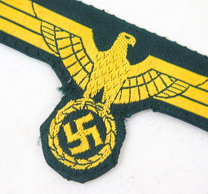 ENG WW2 German Wehrmacht navy Coastal artillery breast eagle. BeVo-type eagle. Gold-yellow eagle on green back ground. Used, removed from jacket. Nice, original insignia.