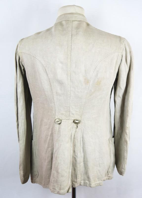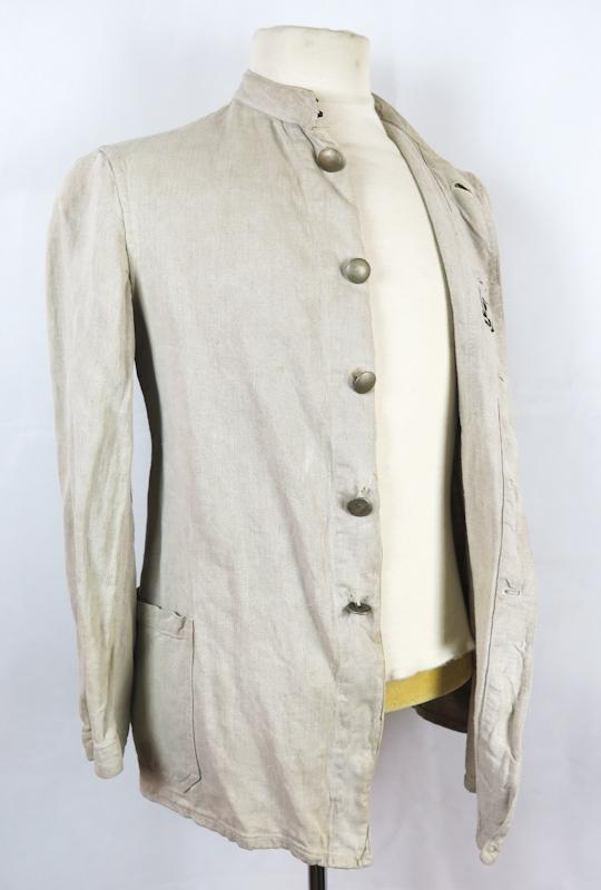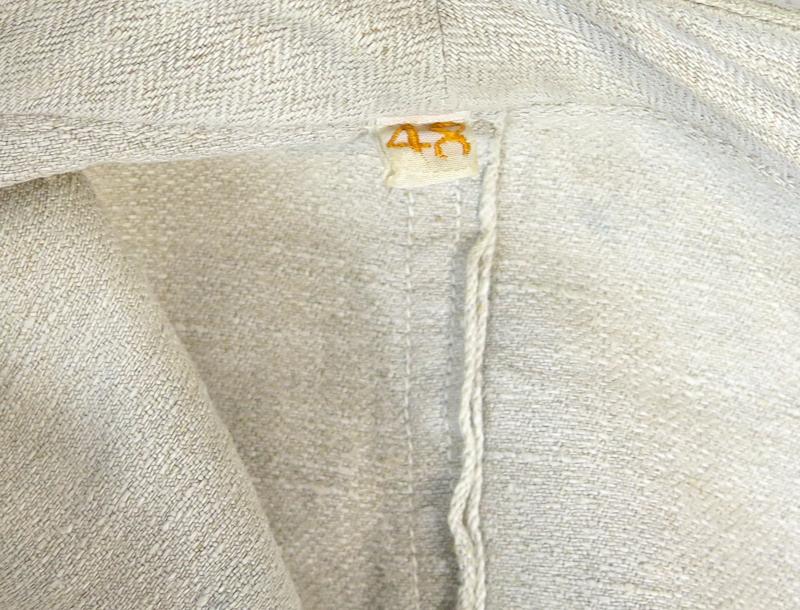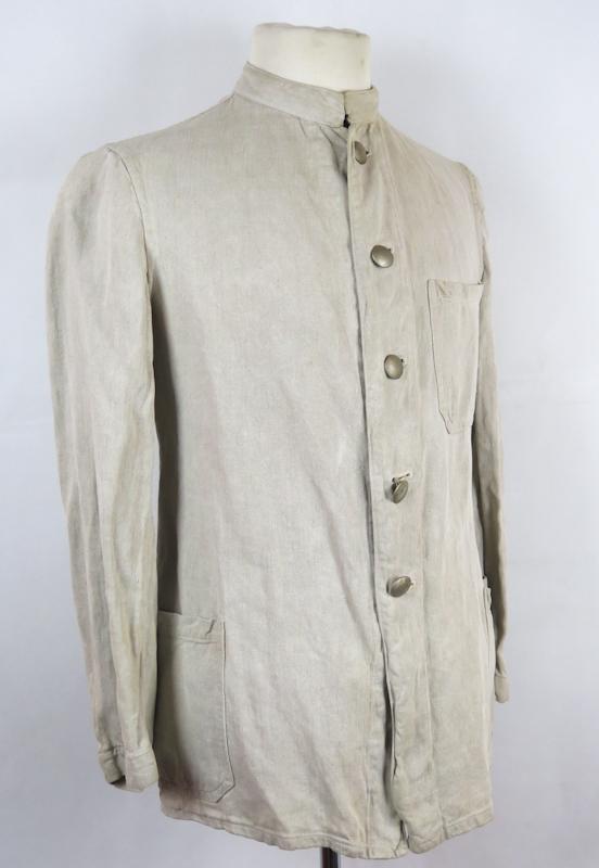 FIN Saksalainen vaalea työtakki. Drillich kangasta. Puserossa on 1MS työtakin ominaisuuksia, mutta pieniä poikkeamia. Napit ovat tyyppiä, joita on usein Reichswehr takeissa. Sisäpuolella Wehrmacht kotka leima, mutta epäilen sen aitoutta. Sisällä koko lappu 48. Erikoinen.