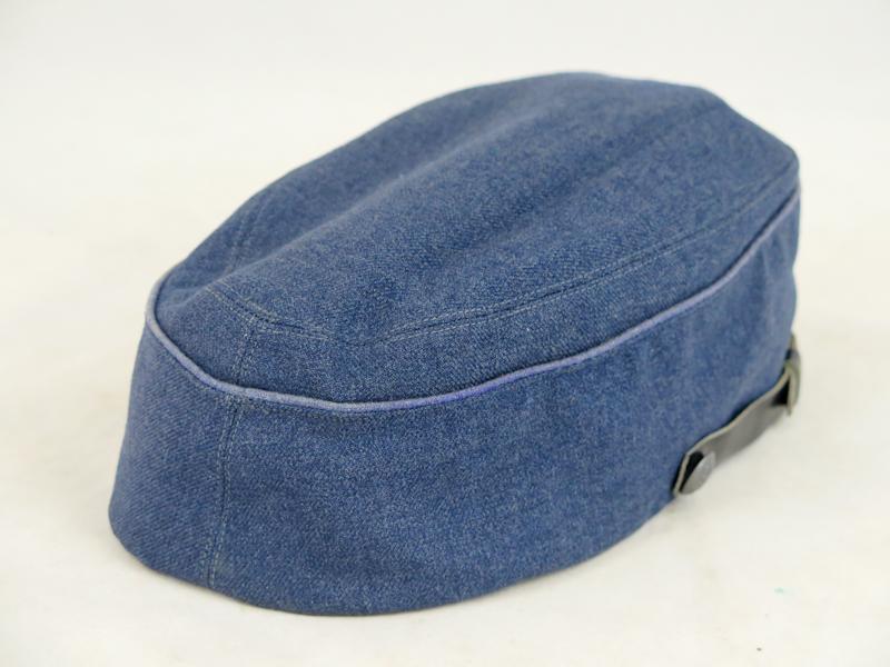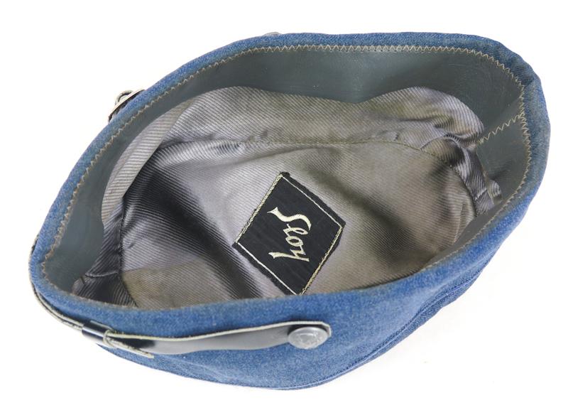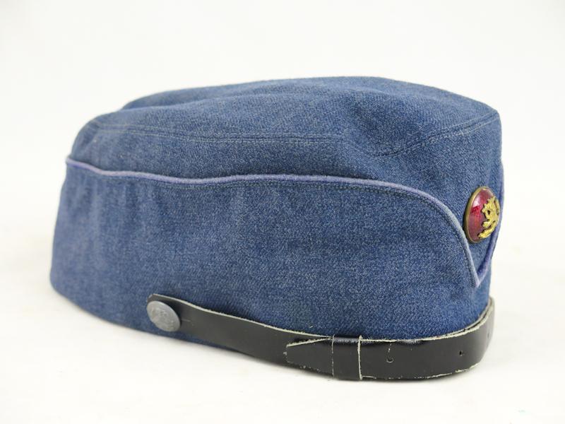 ENG Early post-war Finnish air force side cap M39. Post-war color cap made from steel blue M51 cloth. Maker is SLOY (Suomen Lakkitehdas OY). Grey lining and leathe sweat band. Black leather chinstrap with buckle. Officers cocade in front of cap. Size is about 56-57. Nice, early 1950/60s side cap.