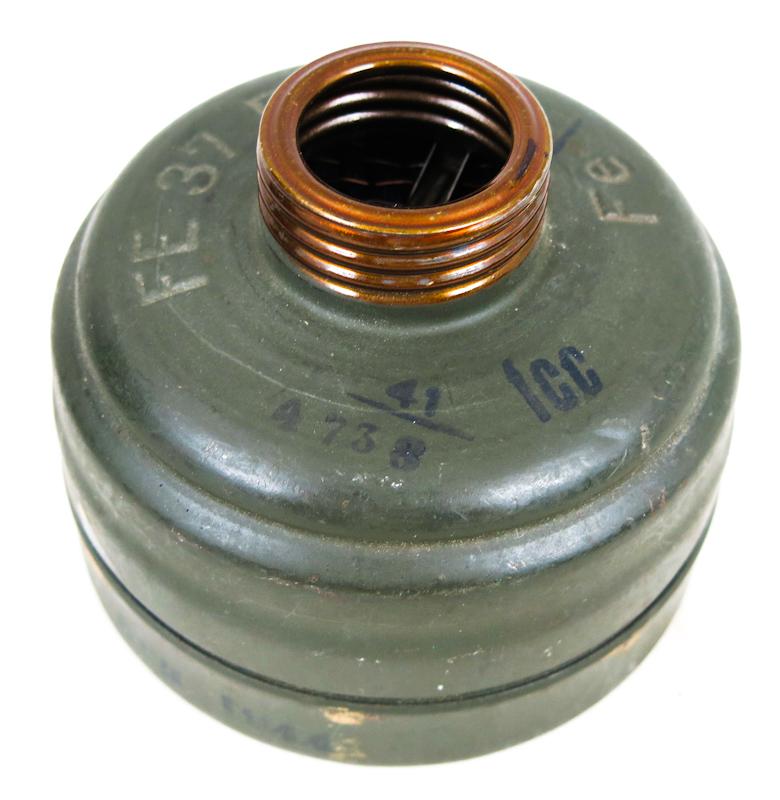 FIN 2MS Saksan Wehrmacht/Waffen-SS kaasunaamari GM38 kanistereineen. Kaasunaamari mallia GM38. Koko 2 eli keskikoko. Naamarin sisällä valmistajan leima "flr". kaasunaamari vuodelta 1943. Uloshengitys ja linssien metalliosat siniset = ei magneettiset. Naamarin kumiosat hyvässä kunnossa. Kaasunaamari siisti kuntoinen ja hihnat ehjät. Suodatin mallia FE37R. Suodattimessa leimat. Suodatin vuodelta 1941, tarkistettu 1944. Kanisterin kannen sisäpuolnen linssisuojus kotelo irroitettu, vuosiluku yleensä merkitty siihen. Loppusodan kanisteri. Kanisterissa vihreä maalipinta. Sisällä alumiini suojus. Hihnat paikallaan. Pitempi hihna kumi vahvikkeella, leimattu "ebd 44". Hyvä, aito loppusodan setti! Huom: Keräilyesine, ei käyttöön.