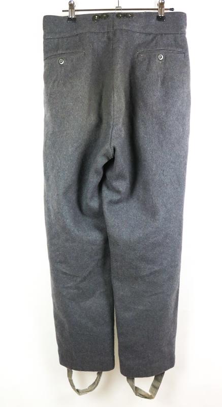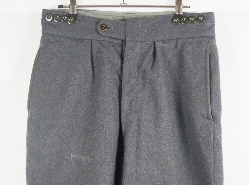ENG Finnish M/36 uniform trousers. Straight leg grey wool serge trousers. Worn and used pair . Trousers marked inside, size 48 B, SA 61 (1961), M(sold) and maker VPu. Grey plastic buttons. Some repairs and markings. Nice issue pair in affordable price. Good pair to complete finnish soldier display!