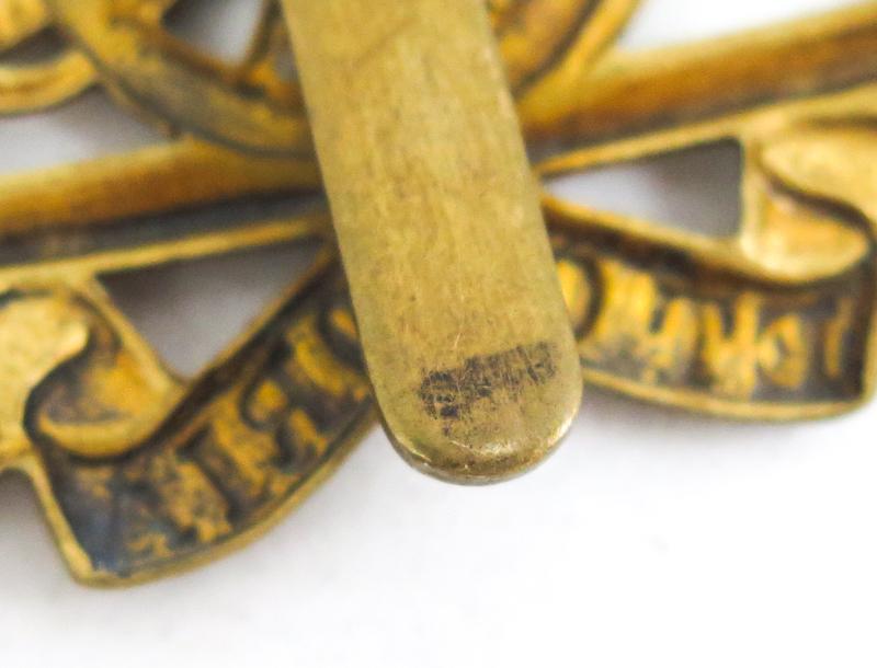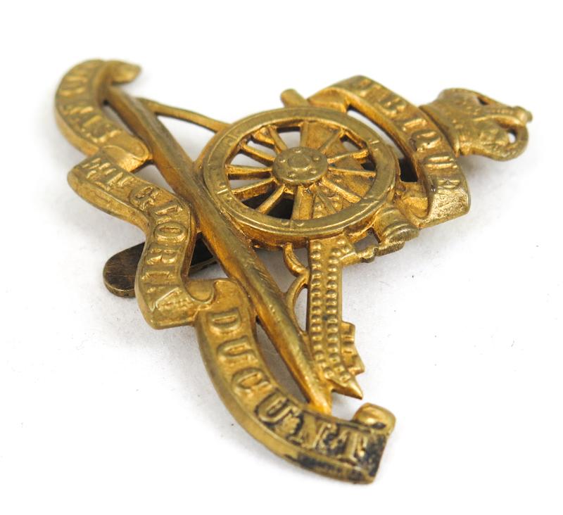 FIN 2MS Britti armeijan lakki merkki Royal regiment of Artillery. Ennen 2MS aikaista valmistetta. Valmistettu messingistä. Valmistajan merkintä hakasessa. Metallinen hakanen lakkiin kiinnittämistä varten. Hyvä, aito 2MS merkki.