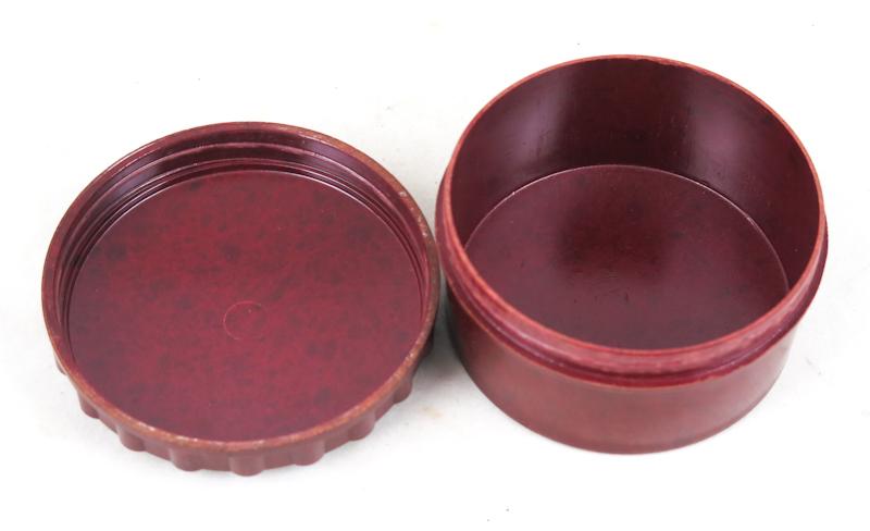 ENG WW2 Finnish butter dose. Red bakelite made box. Voluntary items to soldiers gear. No maker marks. Last image from SA-kuva archive from wartime showing same kind of doses on the shelf of canteen. Nice, original box.