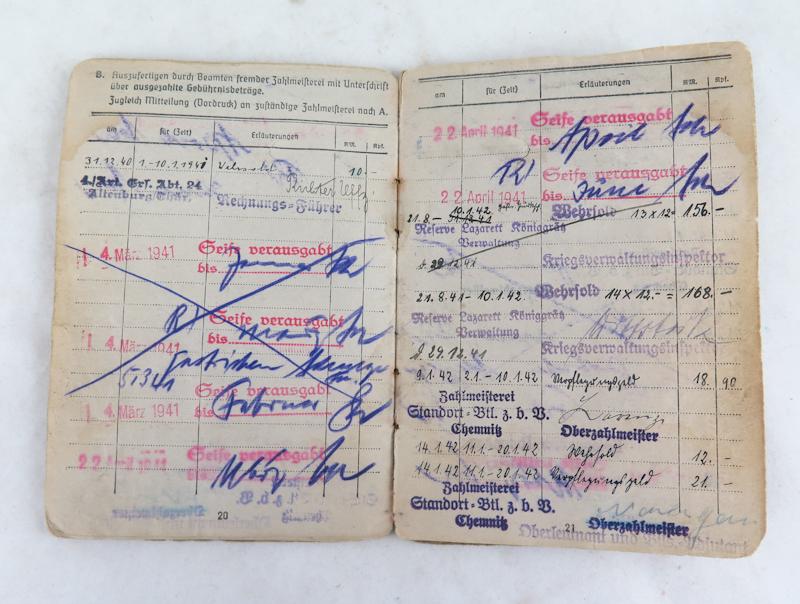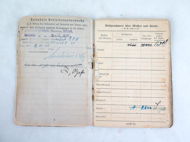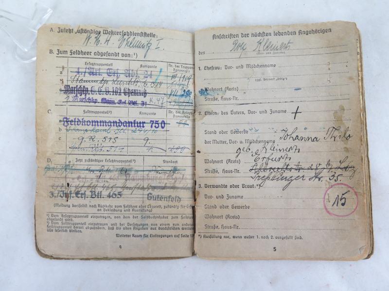 ENG WW2 German Wehrmacht army Soldbuch. unteroffizier Kleinerth. Infantrysoldier. Combat unit marked Feldkommandantur 750 (Vannes) and grenadier regiment 515. Awards not marked. Armed with rifle. Good used condition. Nice, original soldbuch.